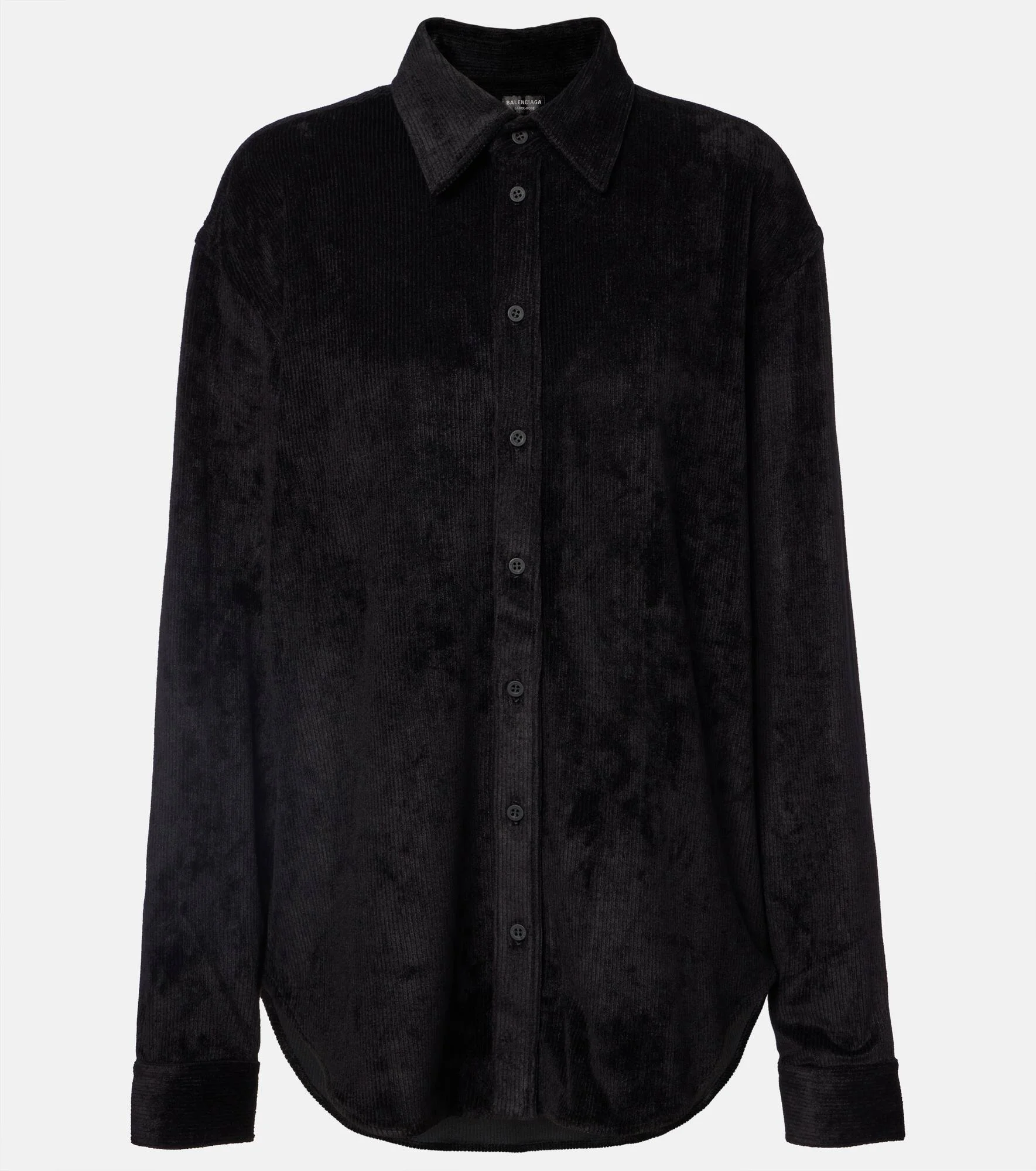 Incorporate Balenciaga's fashion-forward styles into your everyday rotation. Cut to a regular fit, this button-down shirt is made from a velvet fabric for a soft touch. Product Details - Material: 77% viscose, 21% polyamide, 2% elastane - Care instructions: dry clean - Made in Italy - Designer color name: Black - Item color: black - Contains non-textile parts of animal origin - Collar: classic (Straight point) - Closure: buttoned placket - Cuff: one button - Hem: rounded - Item number: P01092748 Size & Fit - True to size - Extra-long sleeves - Dropped shoulders - Designed for a loose fit - Stretchy fabric - Falls below the hip - The model seen in the picture is 178cm-5'10" and wearing a size FR 36