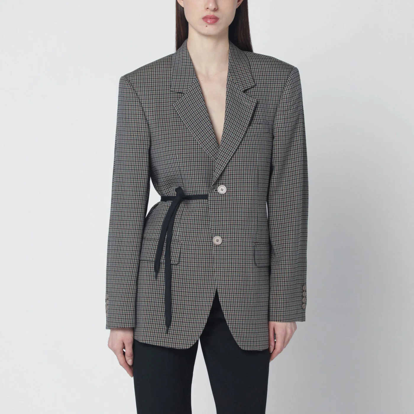 Single-breasted jacket by Balenciaga in lyocell with khaki and brown gingham pattern• Classic lapel• One chest welt pocket• Two front flap pockets• Long sleeves with buttoned cuffs• Side lace detail• Back vent