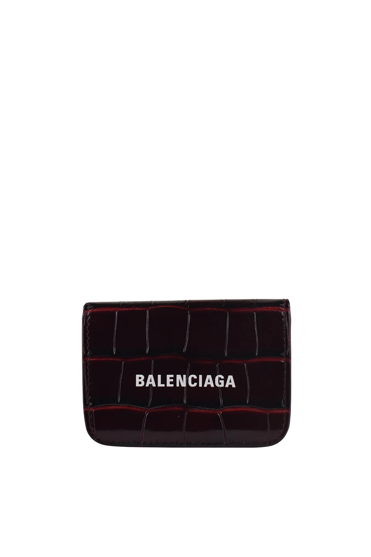 Cash Mini Balenciaga wallet in burgundy crocodile-effect leather. White "Balenciaga" logo writing on front. Rounded ends. Bill pocket. Integrated coin purse with snap closure. Made in Italy.