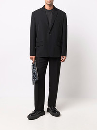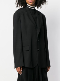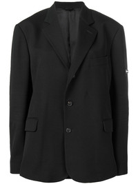 washed button-front jacket Balenciaga likes to make its presence known within each collection. The latest season brought a series of wardrobe staples, all stamped with a contrasting logo print for recognition like this button-front blazer. Highlights - Black - Logo print at the chest - Notched lapels - Front button fastening - Long sleeves - Chest flap pockets Made in Italy Composition Lining: Cotton 100% Outer: Viscose 100% Washing instructions Dry Clean Only