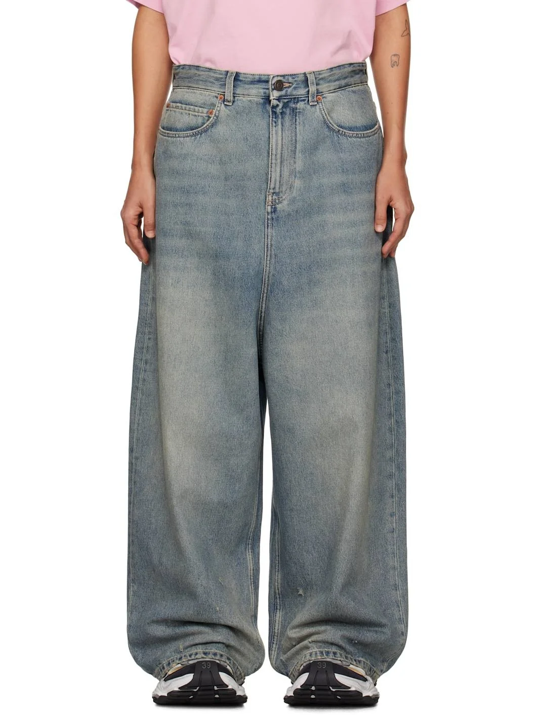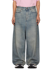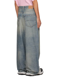 Non-stretch denim jeans. Fading, whiskering, and subtle distressing throughout. · Mid-rise · Belt loops · Five-pocket styling · Zip-fly · Dropped inseam · Logo patch at back waistband Supplier color: Blue rust