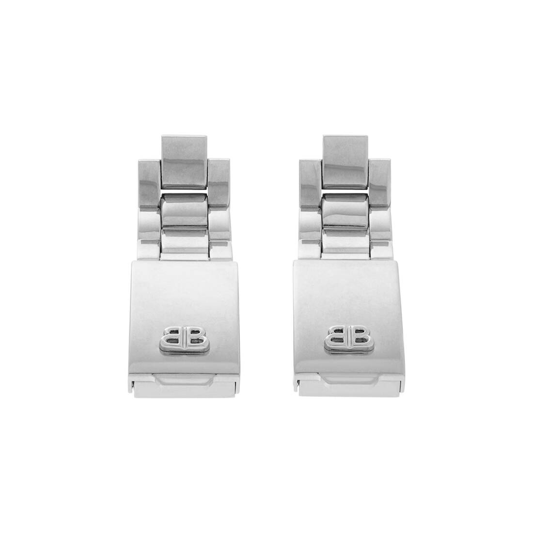 24/7 Earrings in silver aluminum and brass are from looks 32 and 50 of Balenciaga Fall 24 Collection. PRODUCT DETAILS • Dimensions: L0,56 x H2,85 x W0,3 inch • Aluminum and brass • Dangling earrings • Watch band design • Monaco BB logo • Round stoppers at the back closure • For pierced ears • Sold as a pair • Made in Italy • This item is nickel-free, lead-free, and hypoallergenic Material: aluminum, brass