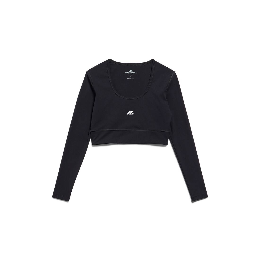 Activewear Long Sleeve Sports Bra in black matte spandex PRODUCT DETAILS • Matte spandex • Scoop neck • Long sleeves • Tone-on-tone overlock stitching • Activewear logo printed at front • Reflective logo • Made in Italy Material: 58% polyamide, 42% elastane