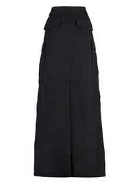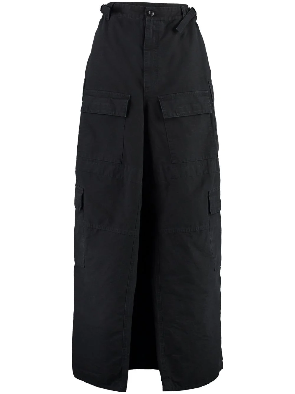 Apron Cargo Pants Skirt in black cotton ripstop is from the look 66 of the Balenciaga's Summer 23 Collection. PRODUCT DETAILS • Cotton ripstop • This item is unisex • Large fit • Multiple styling possibilities • Pants at front • Skirt at back • 5 belt loops • 2 belt tabs on sides to adjust waistline • Covered zip fly • 2 cargo pockets at front • 2 cargo pockets on each side • 2 flap pockets at back • 1 slit at back • Floor length • Made in Italy • Dry cleaning • Model is 174 cm / 5'8" and is wearing a size S Material: 100% cotton