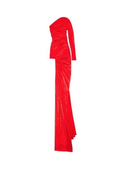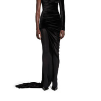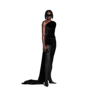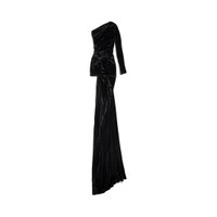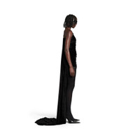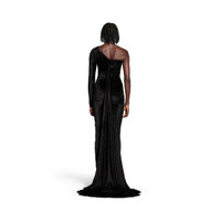 Asymmetric Dress in black fluid velvet jersey is from look 61 of Balenciaga Fall 24 collection. PRODUCT DETAILS • Fluid velvet jersey • Fully draped • Asymmetric construction • Long sleeve at left • Sleeveless at right • Invisible zip at back • Maxi length • Made in Italy Material: 70% triacetate, 30% polyester