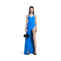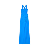 Asymmetric Dress in blue matte spandex for Women is from look 71 of Balenciaga Winter 25 Collection. PRODUCT DETAILS • Long asymmetrical draped dress • Swimsuit inspired • Racer back • Opening at lower back • Long draped panel on right front • Long draped panel at back • Made in Italy Main material: 80% polyamide, 20% elastane