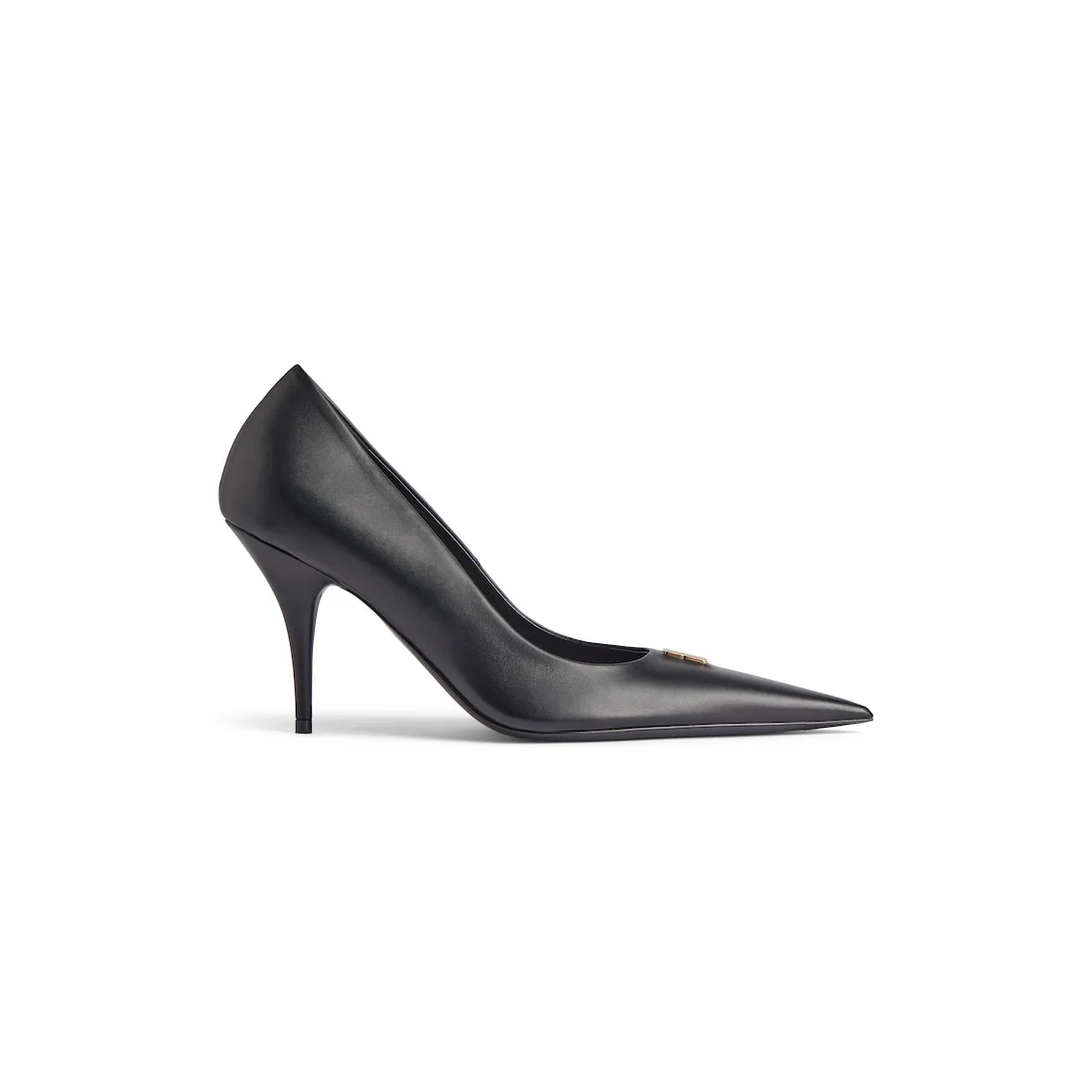 Avenue BB Editor 90mm Pump in black shiny soft calfskin PRODUCT DETAILS • Shiny soft calfskin • Pump • Elongated pointed toe • 90mm arch • Knife heel • Gold Nano BB logo on the upper • Tone-on-tone covered heel • Black sole • Made in Italy Upper: calfskin - Sole: calfskin, TPU - Insole: goatskin