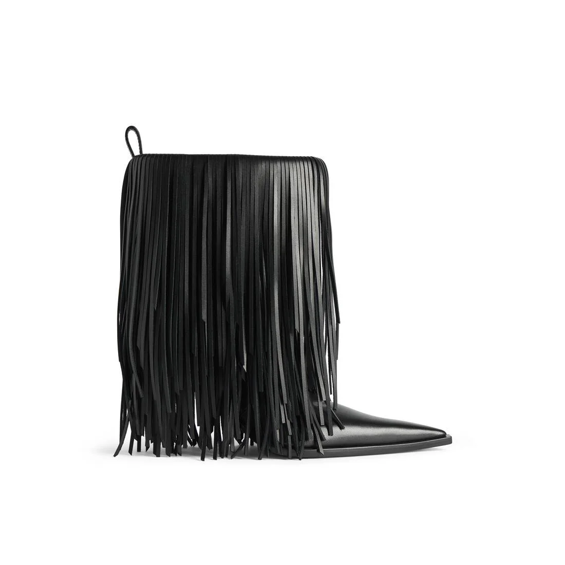 Avenue Fringe 90mm Bootie in black matte calfskin PRODUCT DETAILS • Matte calfskin • Bootie with fringes • Elongated pointed toe • 90mm arch • Knife heel • Loop on the back • Balenciaga logo debossed on the back • Tone-on-tone covered heel • Black sole • Made in Italy Upper: calfskin - Sole: calfskin - Insole: calfskin