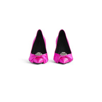 Avenue Palazzo 90mm Pump in fuchsia satin and rhinestones PRODUCT DETAILS • Viscose and silk • Pump • Elongated pointed toe • 90mm arch • Knife heel • Ribbon and rhinestones jewelry on the upper • Tone-on-tone covered heel • Black sole • Made in Italy Upper: viscose, silk - Sole: calfskin, TPU - Insole: goatskin