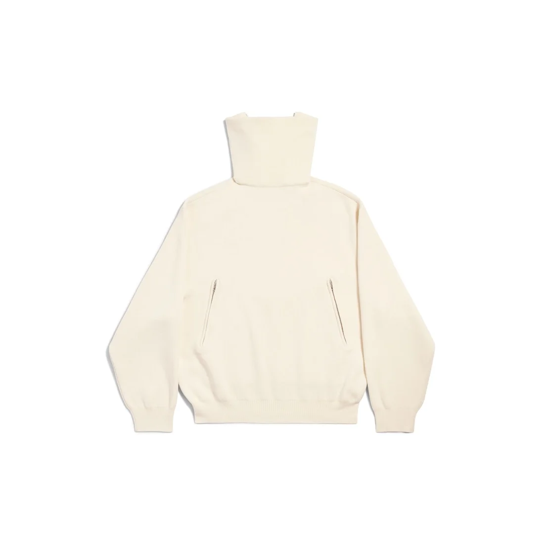 Back-to-Front High Neck Sweater in off white compact wool knit for Women PRODUCT DETAILS • Wool knit • Construction reversed, back becomes front • High neck • Dropped shoulders • Long sleeves • Ribbed trims • Two zipped pockets at front • Open zipped back collar • Made in Italy Main material: 100% wool