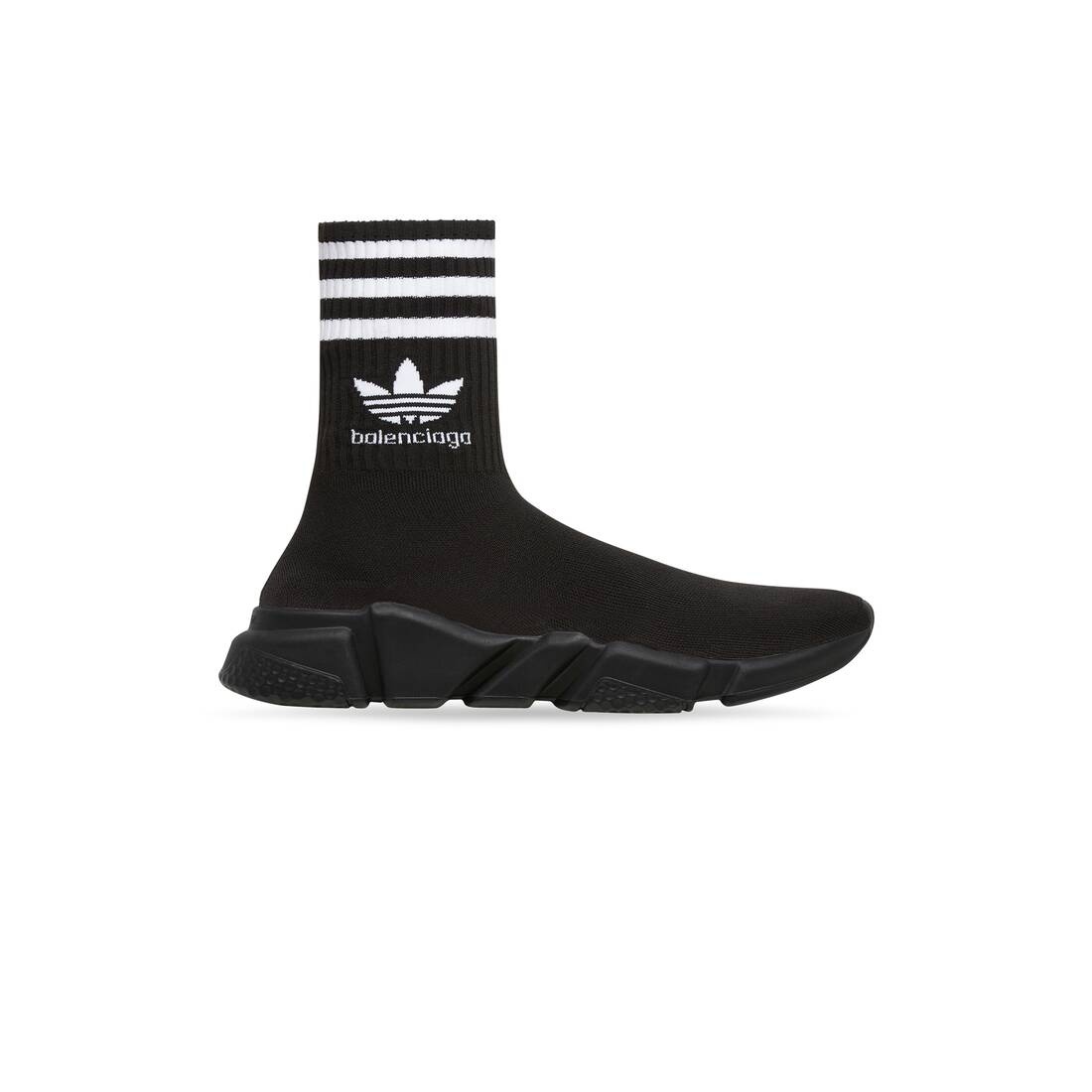 adidas Speed Sneaker in black and white knit and black sole unit is done in collaboration with adidas. PRODUCT DETAILS • Technical 3D knit • Ultra-flexible molded sole • "No Memory” sole technology monocolor sole unit • Extra light: nearly barefoot feel • Embossed Balenciaga logo on the back of sole • Contrasting 3-Stripes mark on the top of the ankle • adidas Trefoil and Balenciaga logos on exterior knit on each side • adidas® collaboration • The Trefoil logo, the 3-Bars logo and the 3-Stripes mark are registered trademarks of adidas • Made in Italy • Do not machine wash and wipe with a soft cloth Material: 85% polyester, 15% elastane