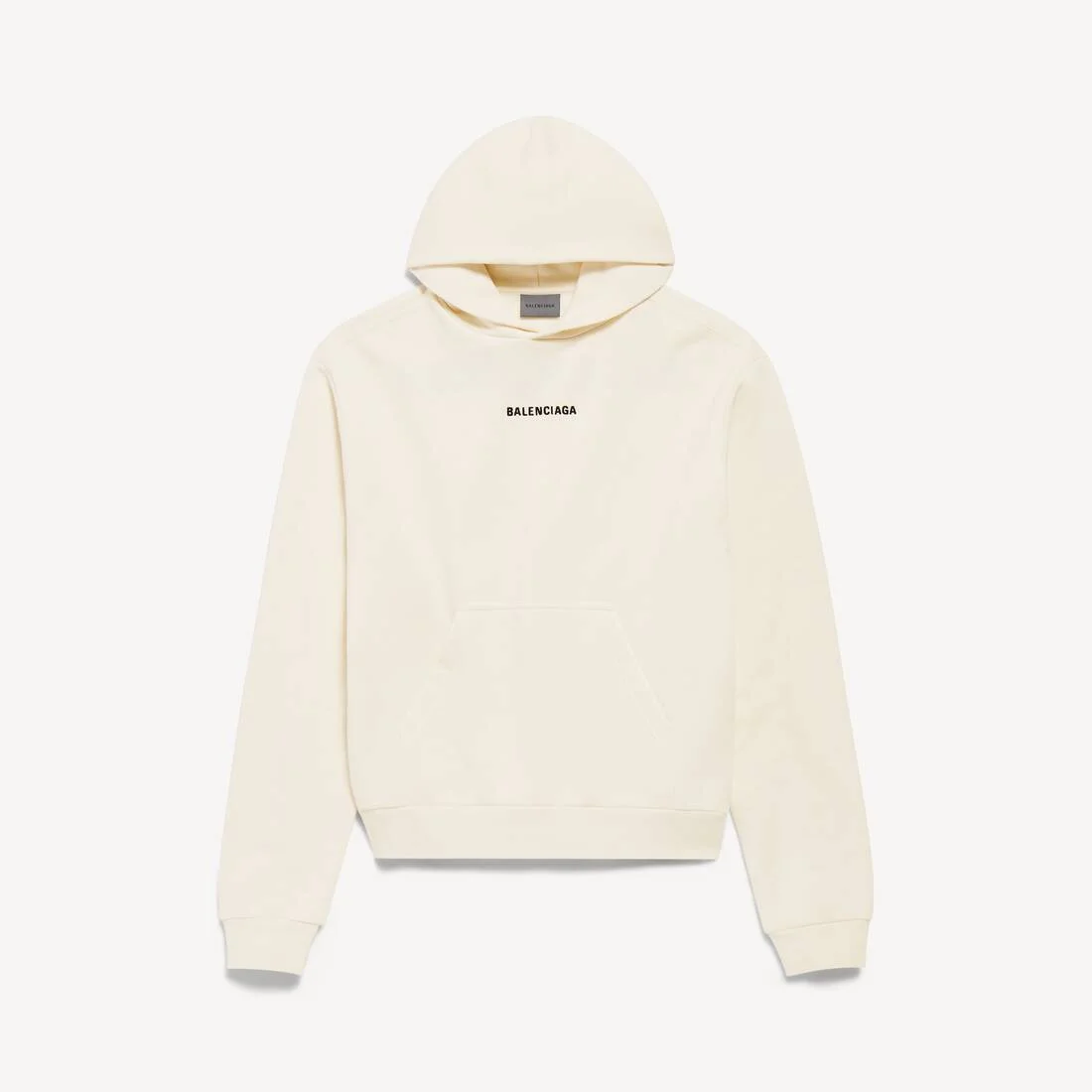Balenciaga Back Hoodie Medium Fit in cream dry fleece PRODUCT DETAILS • Dry fleece • Hood without drawstring • Dropped shoulders • 1 kangaroo pocket on front • Gathered at cuffs and waistline • Balenciaga Back artwork embroidered on the front and back • Made in Portugal Main material: 100% cotton
