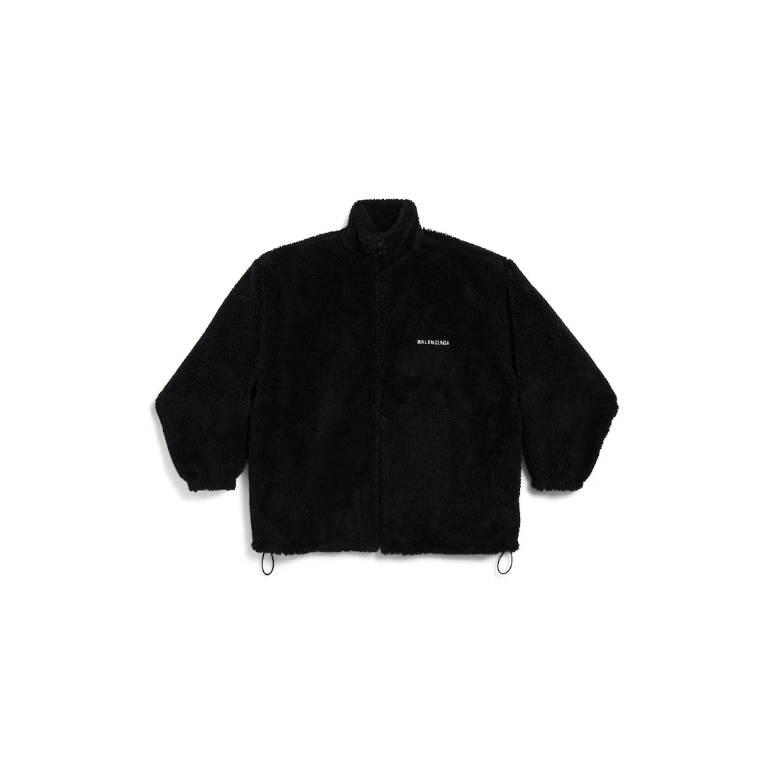 Balenciaga Back Zip-Up Jacket in black and white synthetic material PRODUCT DETAILS • Synthetic material: faux-shearling • High neck • Double-ended zip fastening • Long sleeves • 2 zipped slash pockets • Gathered at cuffs and waistline • Drawstring at waistline • Balenciaga Back artwork embroidered at chest and back • Made in Italy Main material: 100% polyester