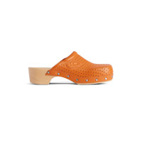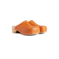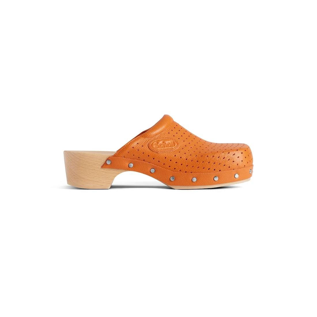Scholl 40mm Clog Mule in pastel orange perforated calfskin PRODUCT DETAILS • Perforated calfskin • Clog • Square toe • 40mm arch • Scholl and Balenciaga logos on the upper • In collaboration with Scholl • Wood sole • Made in Italy Upper: calfskin - Midsole: wood - Sole: micro