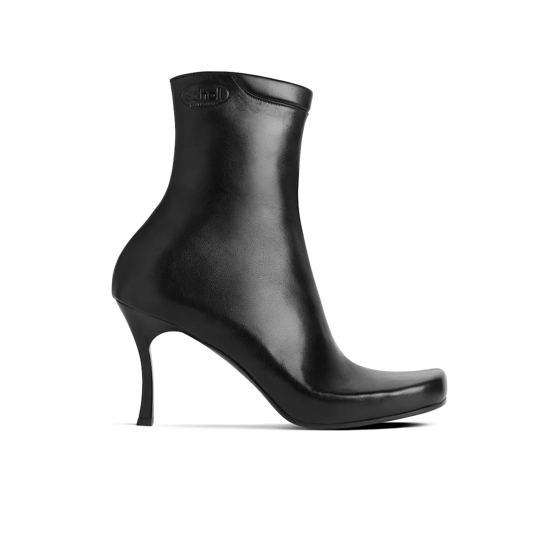 Scholl 80mm Bootie in black smooth sheepskin PRODUCT DETAILS • Smooth sheepskin • Boot • Square toe • 80mm arch • Inner zipped closure • Scholl and Balenciaga logos debossed on the upper • In collaboration with Scholl • Ergonomic insole • Black heel • Made in Italy Upper: sheepskin - Sole: calfskin - Insole: calfskin