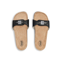 Scholl Flat Sandal in black calfskin PRODUCT DETAILS • Calfskin • Flat sandal • Open toe • One leather strap with adjustable metallic buckle • Scholl and Balenciaga logos engraved on the buckle • In collaboration with Scholl • Ergonomic insole • Cork-covered sole • Black outsole • Made in Italy Upper: calfskin - Sole: micro - Insole: calfskin