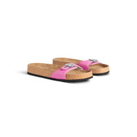 Scholl Flat Sandal in glossy pink Arena Storico lambskin PRODUCT DETAILS • Arena Storico lambskin • Flat sandal • Open toe • One leather strap with adjustable metallic buckle • Scholl and Balenciaga logos engraved on the buckle • In collaboration with Scholl • Ergonomic insole • Cork-covered sole • Black outsole • Made in Italy Upper: lambskin - Sole: micro - Insole: calfskin