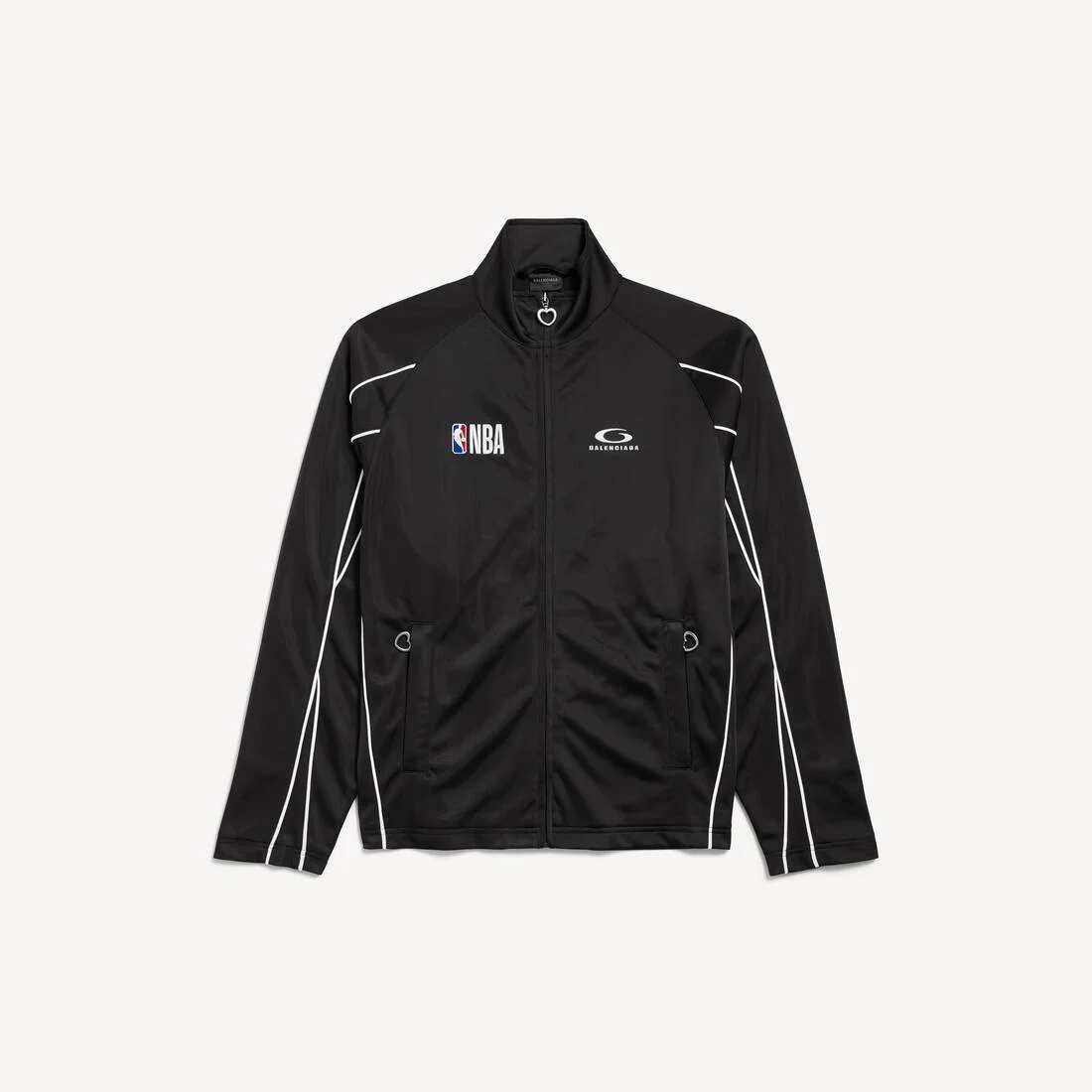 BALENCIAGA | NBA COLLABORATION Tracksuit Jacket in black and white technical jersey PRODUCT DETAILS • Technical mesh polyester • High neck • Front zipped closure • Long sleeves • Contrasting yokes • 2 zipped slash pockets • NBA artwork and loop sports icon artwork embroidered on chest • In collaboration with the NBA • Made in Portugal • The NBA and individual NBA member team identifications reproduced on this product are trademarks and copyrighted designs, and/or other forms of intellectual property, that are the exclusive property of NBA Properties, Inc. and the respective NBA member teams and may not be used, in whole or in part, without the prior written consent of NBA Properties, Inc. © 2026 NBA Properties, Inc. All rights reserved. Main material: 100% polyester
