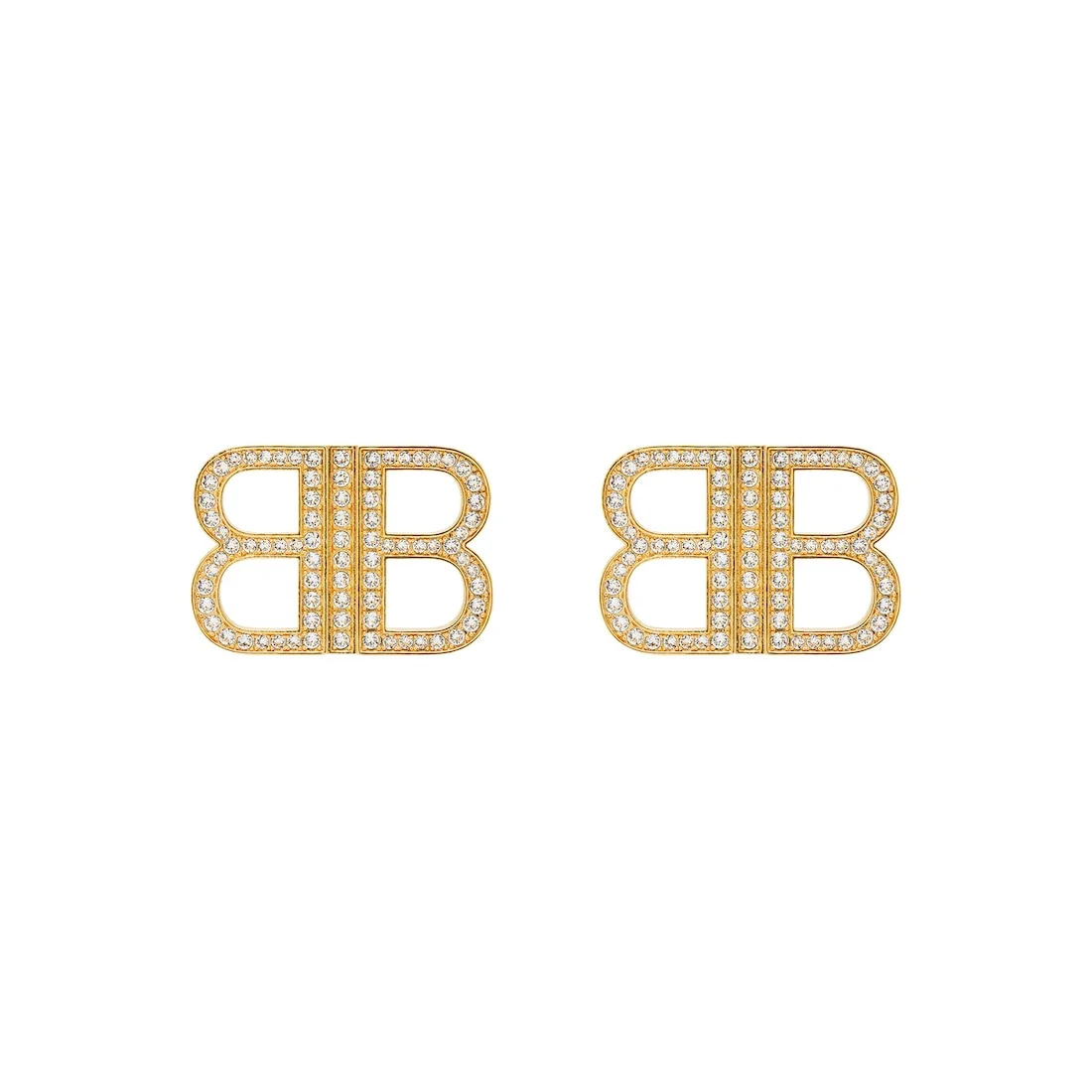 BB 2.0 Earrings in gold aluminium, brass and rhinestones PRODUCT DETAILS • Dimensions : L2,1 x H1,5 x W0,2 inch • Aluminium, brass and glass • Earrings • BB logo with white rhinestones • BB charm at the back closure • For pierced ears • Sold as a pair • Made in Italy • Wipe with a soft cloth Material: 50% aluminium, 30% brass, 20% glass