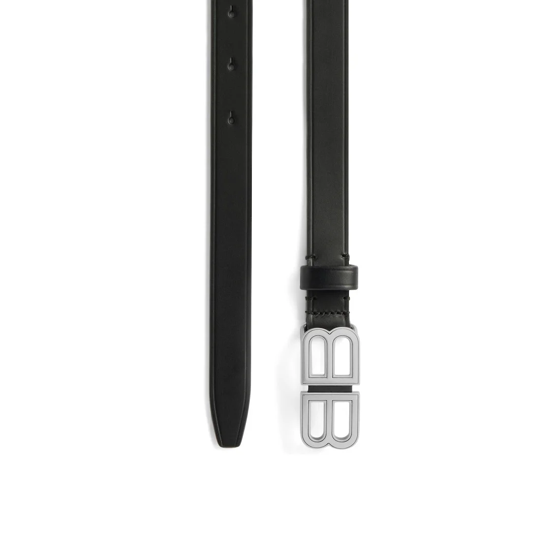 BB Hourglass Thin Belt in black natural calfskin, aged-silver hardware PRODUCT DETAILS • Dimensions: Width: 0,8 inch • Natural calfskin • Aged-silver BB logo hardware • 5 notches on the belt • Tone-on-tone leather loop • Made in Italy Material: 100% calfskin