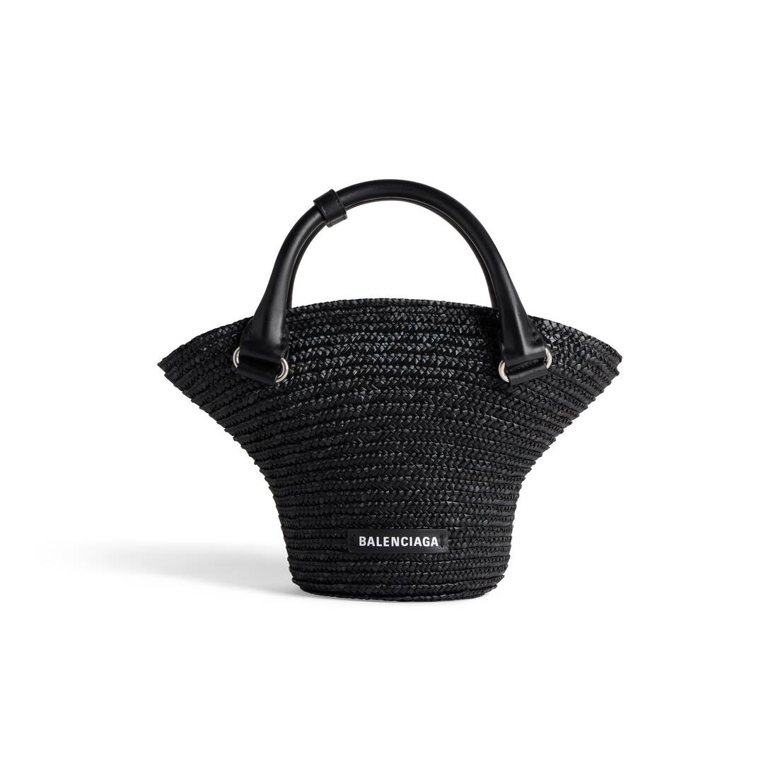 Beach Bag Mini Tote in black straw, aged-silver hardware PRODUCT DETAILS • Dimensions: L13,8 x H7,9 x W5,1 inch • Handle drop: 2,4 inch • Straw • Upside down straw hat design • Two handles with one handle clip • Removable and adjustable strap (18,1 inch) • Balenciaga logo at front • Aged-silver hardware • Knotted closure in jacquard nylon with tone-on-tone Balenciaga logo • 1 inner flat pocket • Leather lining at base • Made in Italy • Wipe with a soft cloth Material: 75% straw, 15% polyamide, 10% calfskin