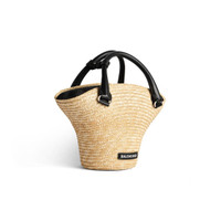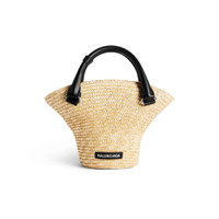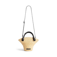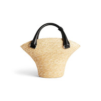 Beach Bag Mini Tote in beige straw, aged-silver hardware PRODUCT DETAILS • Dimensions: L13,8 x H7,9 x W5,1 inch • Handle drop: 2,4 inch • Straw • Upside down straw hat design • Two handles with one handle clip • Removable and adjustable strap (18,1 inch) • Balenciaga logo at front • Aged-silver hardware • Knotted closure in jacquard nylon with tone-on-tone Balenciaga logo • 1 inner flat pocket • Leather lining at base • Made in Italy • Wipe with a soft cloth Material: 75% straw, 15% polyamide, 10% calfskin