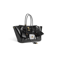 Bel Air Carry All Bag Medium in black crocodile embossed calfskin, aged-gold hardware PRODUCT DETAILS • Dimensions: L14,5 x H11 x W6,7 inch • Crocodile embossed calfskin • Carry all • Two handles with one handle clip (drop: 7,8 inch) • Shoulder and hand carry • Balenciaga Paris logo debossed with foil at back • Removable cloche cles with two split rings • Aged-gold hardware • Side snaps • Turn lock closure • Logo engraved on the closure system • Wide front pocket • 1 main compartment • 2 inner zipped pockets • 2 inner flat pockets • Nappa lambskin bonded lining • Made in Italy Material: calfskin