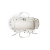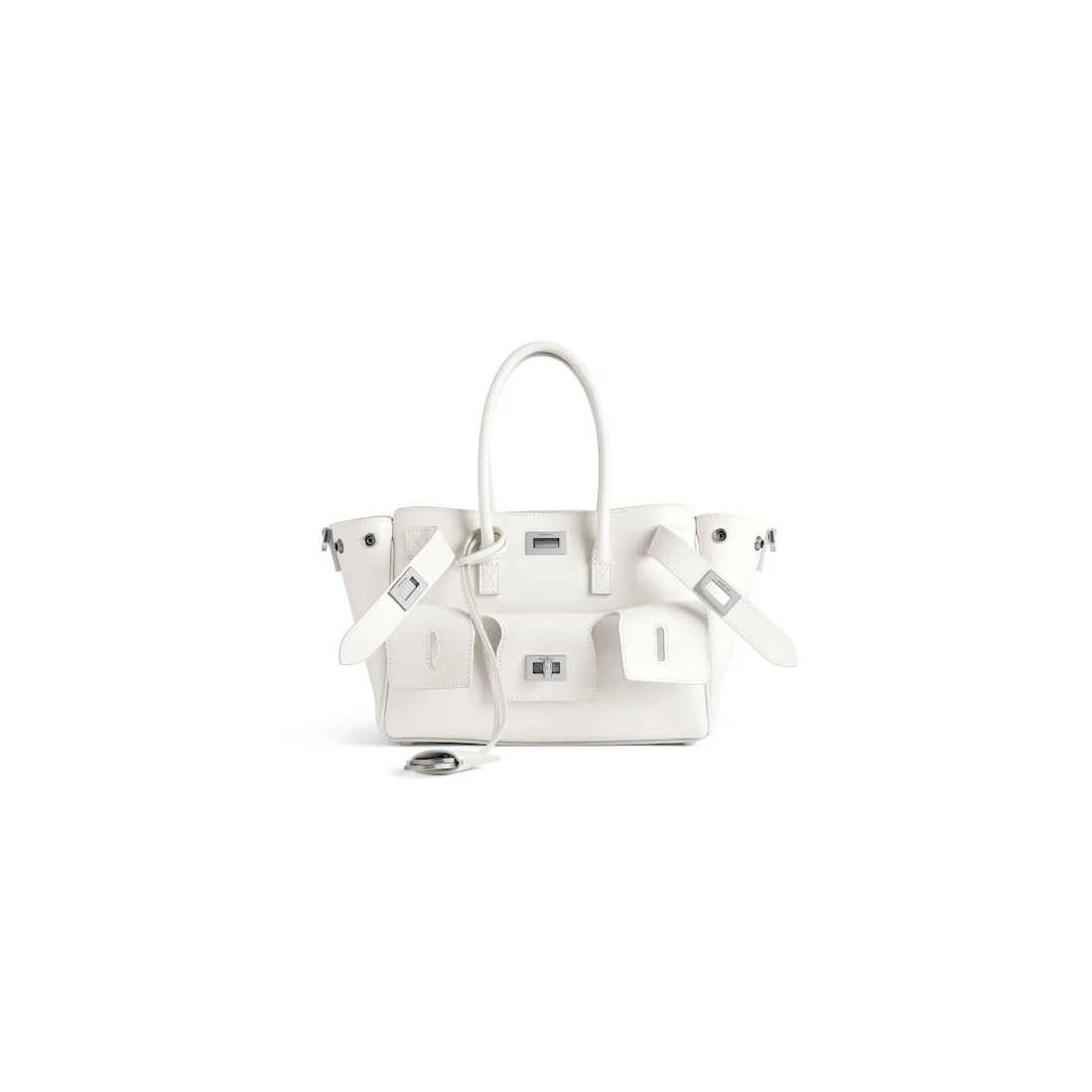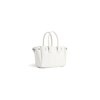 Bel Air Carry All Bag Mini in white smooth calfskin, aged-silver hardware PRODUCT DETAILS • Dimensions: L9,2 x H6,7 x W3,1 inch • Smooth calfskin • Carry all • Two handles (drop: 4,3 inch) • Adjustable and removable strap (drop: 17,3 inch) • Shoulder, crossbody and hand carry • Balenciaga Paris logo debossed with foil at back • Removable cloche cles with two split rings • Aged-silver hardware • Side snaps • Turn lock closure • Logo engraved on the closure system • Wide front pocket • 1 main compartment • 2 inner zipped pockets • Nappa lambskin bonded lining • Made in Italy Material: calfskin