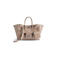 Bel Air Carry All Bag Small in taupe smooth calfskin, aged-silver hardware PRODUCT DETAILS • Dimensions: L11,8 x H8 x W4,7 inch • Smooth calfskin • Carry all • Two handles (drop: 6,7 inch) • Adjustable and removable strap (drop: 20,4 inch) • Shoulder, crossbody and hand carry • Balenciaga Paris logo debossed with foil at back • Removable cloche cles with two split rings • Aged-silver hardware • Side snaps • Turn lock closure • Logo engraved on the closure system • Wide front pocket • 1 main compartment • 2 inner zipped pockets • 2 inner flat pockets • Nappa lambskin bonded lining • Made in Italy Material: calfskin