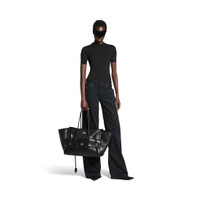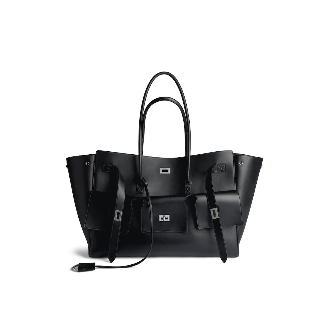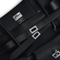 Bel Air Large Carry All Bag in black smooth calfskin, aged-silver hardware PRODUCT DETAILS • Dimensions: L17,3 x H11,8 x W7,4 inch • Smooth calfskin • Carry all • Two handles (drop: 9,4 inch) • Shoulder and hand carry • Balenciaga Paris logo debossed with foil at back • Removable cloche cles with two split rings • Aged-silver hardware • Side snaps • Turn lock closure • Logo engraved on the closure system • Wide front pocket • 1 main compartment • 2 inner zipped pockets • 2 inner flat pockets • Nappa lambskin bonded lining • Made in Italy Material: calfskin