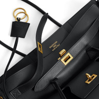 Bel Air Medium Carry All Bag in black smooth calfskin, aged-gold hardware PRODUCT DETAILS • Dimensions: L10,2 x H11,4 x W6,3 inch • Smooth calfskin • Carry all • Two handles (drop: 7,8 inch) • Shoulder and hand carry • Balenciaga Paris logo debossed with silver foil at back • Removable leather key holder with two split rings • Aged-gold hardware • Side snaps • Turn lock closure and belts to close the front part • Logo engraved on the closure system • Wide front pocket • 1 main open compartment • 2 inner zipped pockets • 2 inner flat pockets • Nappa lambskin bonded lining • Made in Italy calfskin