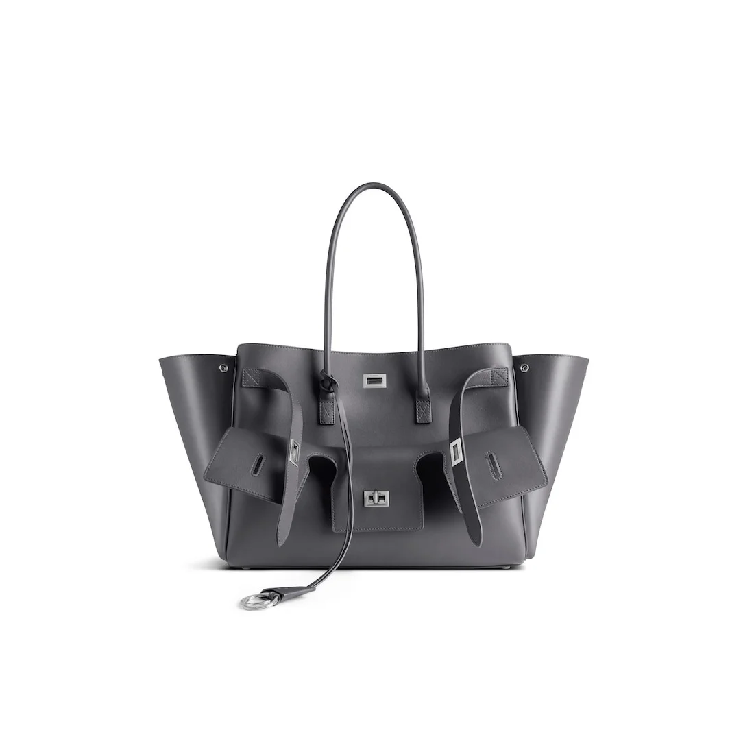Bel Air Medium Carry All Bag in grey smooth calfskin, aged-silver hardware PRODUCT DETAILS • Dimensions: L14,5 x H11 x W6,7 inch • Smooth calfskin • Carry all • Two handles (drop: 7,8 inch) • Shoulder and hand carry • Balenciaga Paris logo debossed with foil at back • Removable cloche cles with two split rings • Aged-silver hardware • Side snaps • Turn lock closure and belts to close the front part • Logo engraved on the closure system • Wide front pocket • 1 main compartment • 2 inner zipped pockets • 2 inner flat pockets • Nappa lambskin bonded lining • Made in Italy Material: calfskin