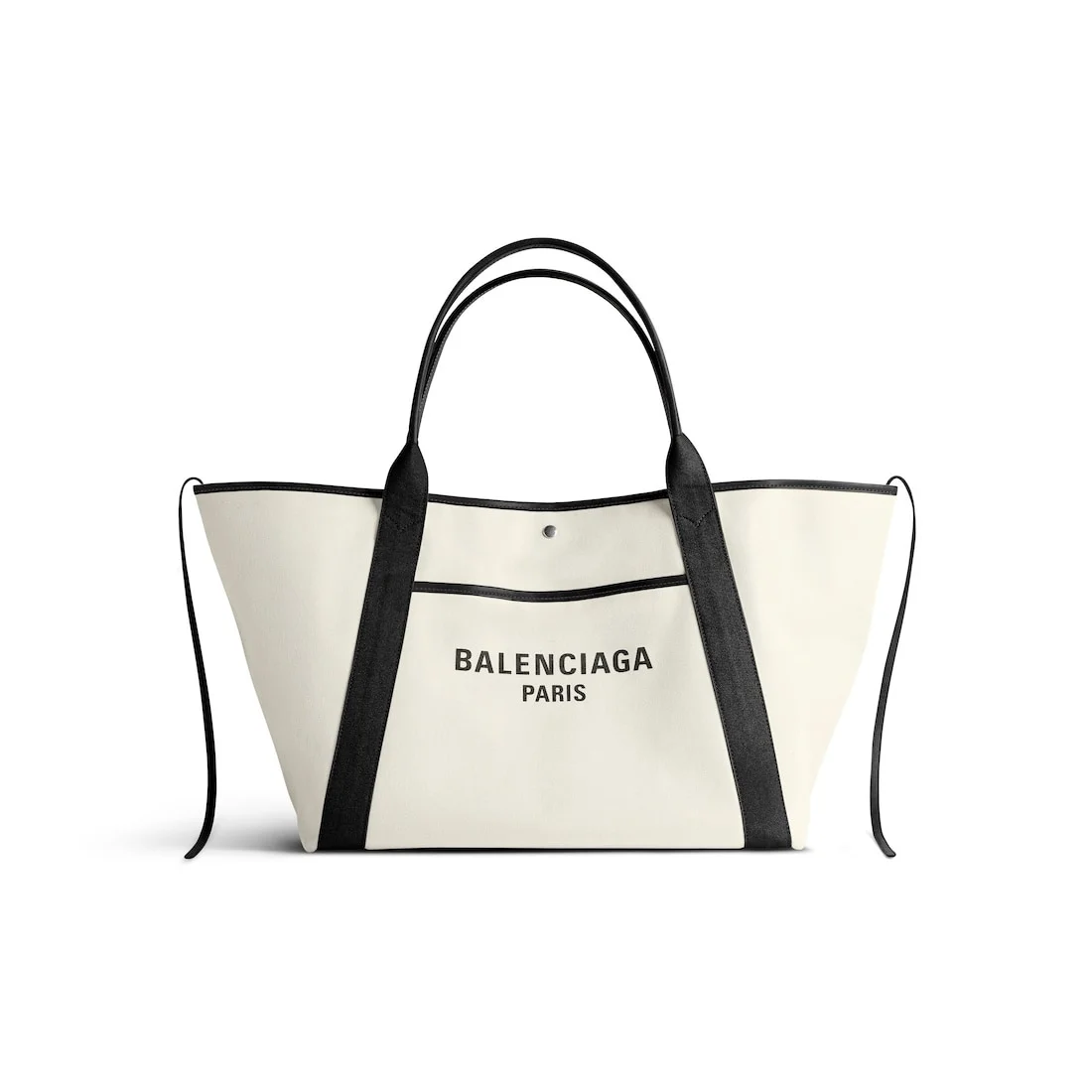 Biarritz Large Tote Bag in natural and black cotton canvas and squared calfskin, aged-silver hardware PRODUCT DETAILS • Dimensions: L16,1 x H12,6 x W10,2 inch • Cotton canvas and squared calfskin • Two handles (drop: 7,8 inch) • Shoulder carry • Two leather laces on the sides • Balenciaga Paris logo printed at front • Aged-silver hardware • Front flat pocket • Snap button closure • 1 main compartment • 1 inner zipped pocket • Cotton canvas lining • Made in Italy cotton, calfskin, viscose