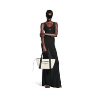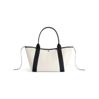 Biarritz Medium Tote Bag in natural and black cotton canvas and squared calfskin, aged-silver hardware PRODUCT DETAILS • Dimensions: L11,4 x H8,6 x W5,5 inch • Cotton canvas and squared calfskin • Two handles (drop: 8,6 inch) • Removable strap (drop: 20,4 inch) • Shoulder and hand carry • Two leather laces on the sides • Balenciaga Paris logo printed at front • Aged-silver hardware • Front flat pocket • Snap button closure • 1 main compartment • 1 inner zipped pocket • Cotton canvas lining • Made in Italy cotton, calfskin, viscose