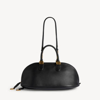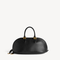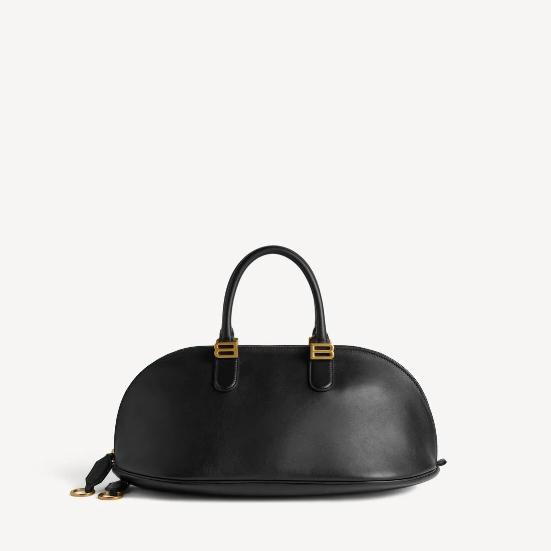 Bolero Bowling Bag Medium in black smooth calfskin and plum nappa lambskin lining with aged-gold hardware is from looks 4 and 29 of Balenciaga Summer 26 Collection. PRODUCT DETAILS • Smooth calfskin • Bowling bag • Two handles with Bolero B logo • Adjustable and removable strap • Shoulder and hand carry • Aged-gold hardware • Zipped closure with leather pull tab and ring • Zipped pocket on the bottom with leather pull tab and ring • 1 main compartment • Contrasting nappa lambskin lining • Made in Italy Material: calfskin
