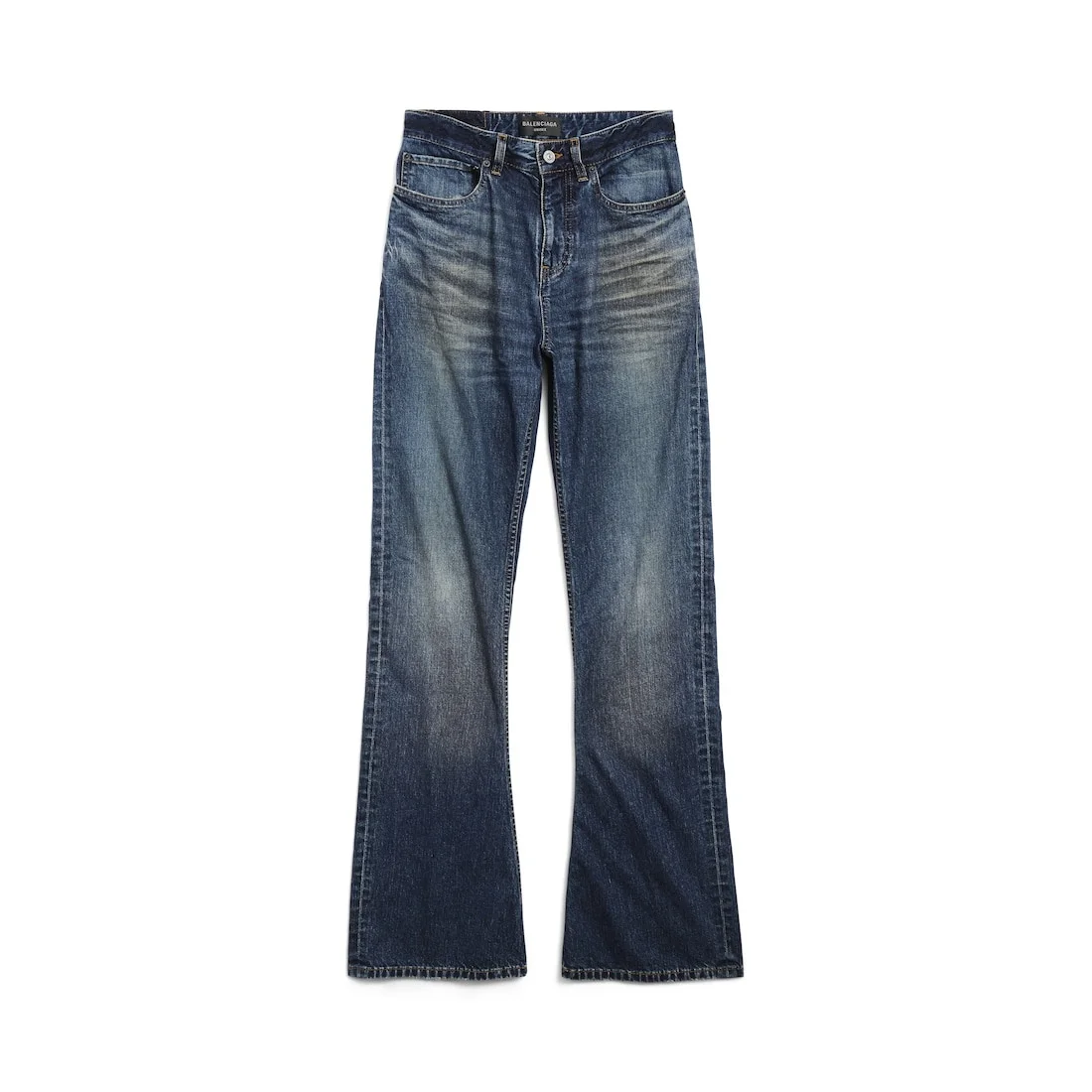 Bootcut Pants in blue cotton denim PRODUCT DETAILS • Soft black left hand denim • Covered zip fly • 5 belt loops • 5 pockets • Balenciaga engraved flex buttons • Balenciaga patch at back • Made in Italy Main material: 100% cotton