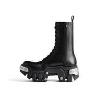 Bulldozer Lace-Up Boot in black matte smooth calfskin PRODUCT DETAILS • Matte smooth calfskin • Lace-up boot • 80mm platform • Chunky design • Round toe • 11 eyelets lace-up vamp • Inner zip • Thick toothed rubber outsole • Balenciaga logo on exterior outsole • Metal details at front and back with Balenciaga logo • BB logo engraved on studs • Leather back pull-on loop • Made in Italy • Wipe with a soft cloth Material: 100% calfskin