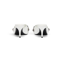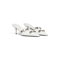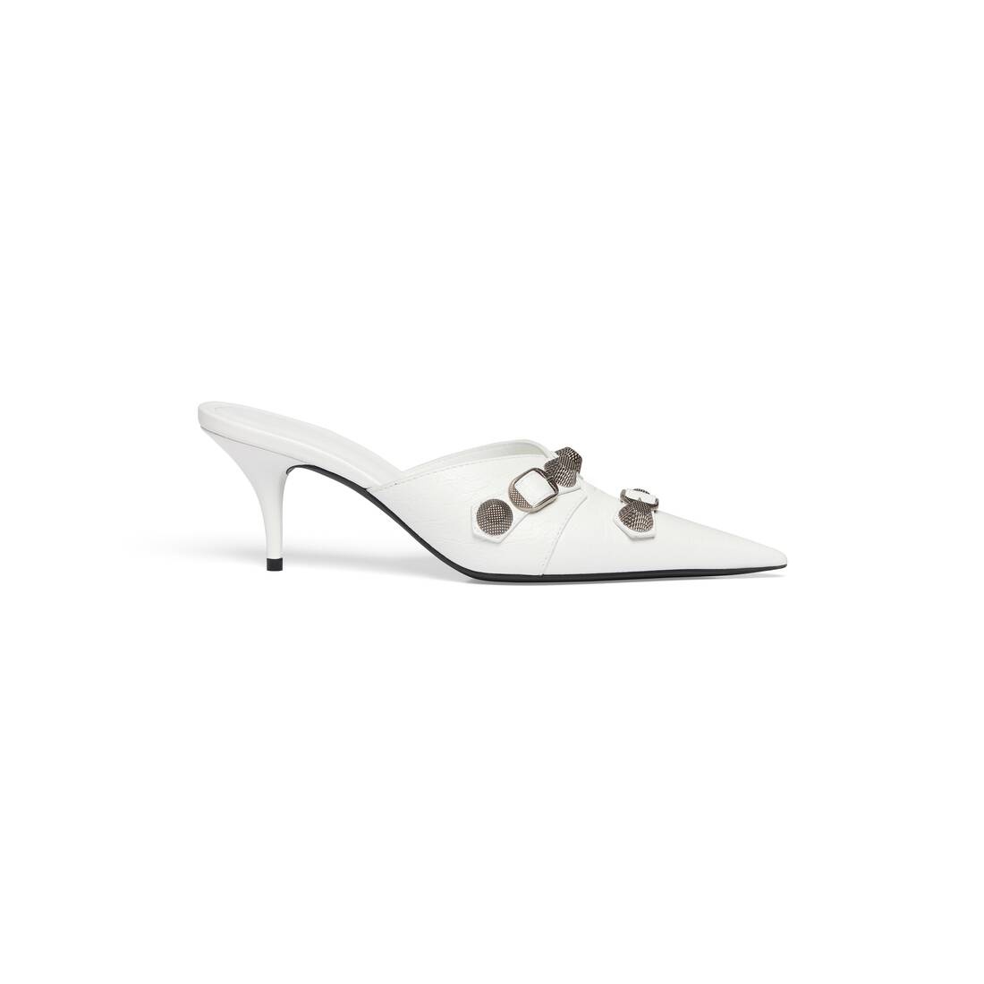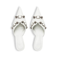 Cagole 70mm Mule in white Arena lambskin PRODUCT DETAILS • Arena lambskin • Mule • Pointed toe • Open at back • 70mm arch • Aged-silver studs and buckles on the upper • Embossed Balenciaga logo on sole part • Tone-on-tone covered heel • Made in Italy • Wipe with a soft cloth Material: 100% lambskin