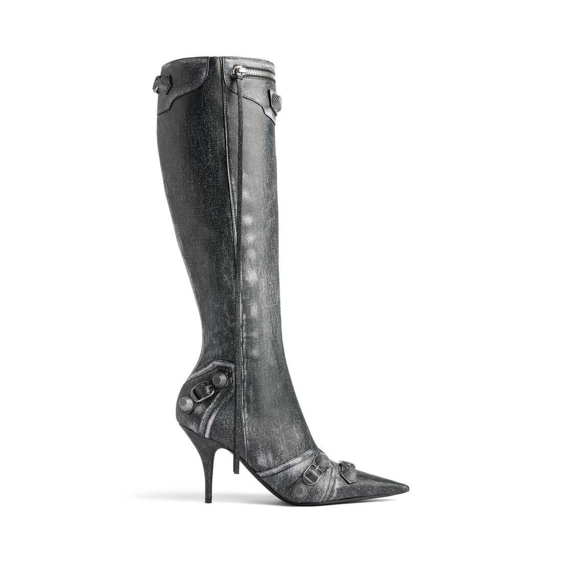 Cagole 90mm Boot in black denim printed Nappa lambskin PRODUCT DETAILS • Denim printed Nappa lambskin • Boot • Pointed toe • 90mm arch • Inner zipped closure with knotted leather puller • Aged-silver studs and buckles • Decorative zip at front with knotted leather puller • Tone-on-tone covered heel • Made in Italy • Wipe with a soft cloth Material: 100% lambskin