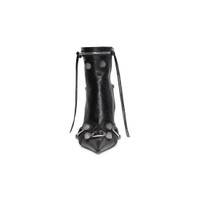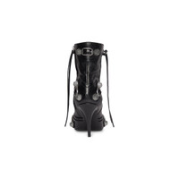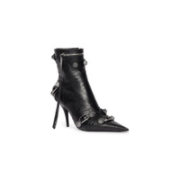 Cagole 90mm Bootie in black Arena lambskin PRODUCT DETAILS • Arena lambskin • Bootie • Pointed toe • 90mm arch • Inner zipped closure with knotted leather puller • Aged-silver studs and buckles • Decorative zip at front with knotted leather puller • Tone-on-tone covered heel • Made in Italy • Wipe with a soft cloth Material: 100% lambskin