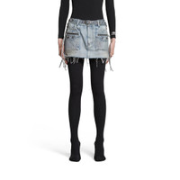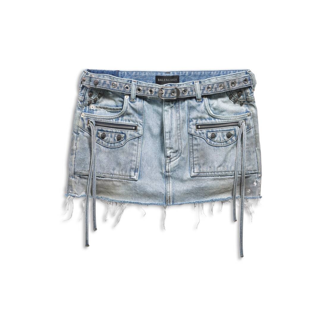 Cagole Mini Skirt in light blue Japanese twill PRODUCT DETAILS • Japanese twill • Fitted • Aged-silver studs and buckles • Mid-waist • Tone-on-tone belt with buckle • 5 belt loops • 5 pockets • Front and back pockets zipped with knotted puller • Frayed hem • Mini length • Made in Japan • Dry cleaning • Model is 179 cm / 5'10" and is wearing a FR size 36 Material: 100% cotton