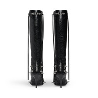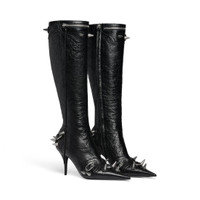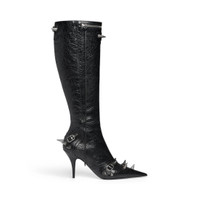 Cagole Spike 90mm Boot in black Arena lambskin PRODUCT DETAILS • Arena lambskin • Boot • Pointed toe • 90mm arch • Inner zipped closure with knotted leather puller • Aged-silver spikes and buckles • Decorative zip at front with knotted leather puller • Tone-on-tone covered heel • Made in Italy • Wipe with a soft cloth Material: 100% lambskin