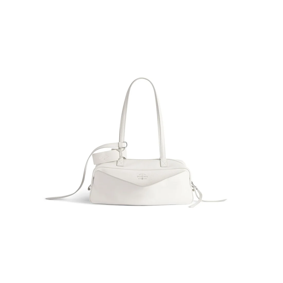 Carrie Small Bowling Bag in white calfskin, aged-silver hardware PRODUCT DETAILS • Dimensions: L12,2 x H4,7 x W4,7 inch • Calfskin • Bowling bag • Two handles with one handle clip (drop: 10,2 inch) • Shoulder and hand carry • Removable leather luggage tag • Balenciaga logo debossed with foil at front • Aged-silver hardware • Front wide pocket • Zipped closure with leather puller • 1 main compartment • 1 inner zipped pocket • Nappa lambskin lining • Made in Italy Material: calfskin