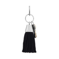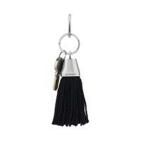 Keychain Pompom in black acetate, zamak and brass PRODUCT DETAILS • Dimensions: L2 x H7,1 x W1,9 inch • Acetate, zamak and brass • Keychain with charms • Balenciaga logo engraved • Aged-silver hardware • Multiple rings to attach on the bag or be used as a Keychain • Made in Italy Material: acetate, zamak, brass