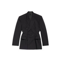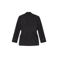 Cinched Jacket in black barathea is from look 7 of Balenciaga’s Spring 24 Collection. PRODUCT DETAILS • Barathea • Fitted • Shoulder pads • Peak lapel • Cinched waistline • 6 button double-breasted front • 2 flap pockets at front • 4 button cuffs • Made in Italy • Dry cleaning 100% wool