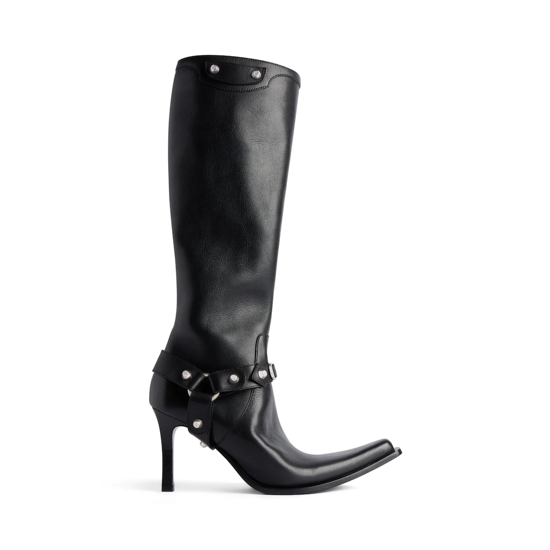 City 90mm Boot With Harness in black soft calfskin PRODUCT DETAILS • Soft calfskin • Boot • Pointed toe • 90mm arch • Hollowed out design at front • Inner zipped closure with knotted leather puller • Removable harness with studs • Black sole • Made in Italy Upper: calfskin - Sole: calfskin - Insole: calfskin