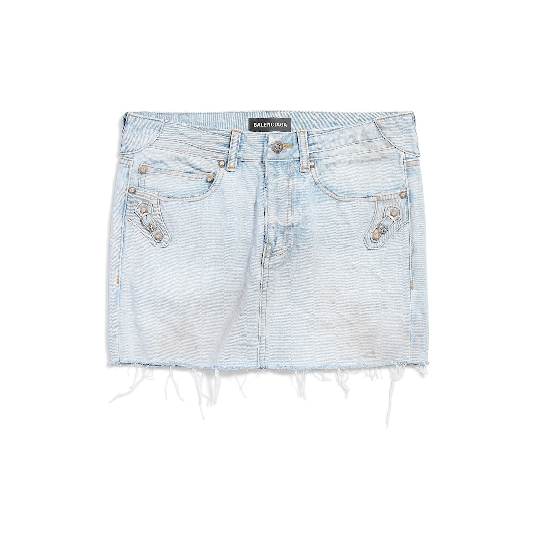 City Mini Skirt in light blue cotton denim for Women PRODUCT DETAILS • Cotton denim • Signature details Le City Bag on front sides and back pockets • Buckles and studs • Mid-waist • Covered button fly • 5 belt loops • 5 pockets • Balenciaga engraved flex buttons • Balenciaga Jeans jacron at back • Raw hem • Made in Italy Main material: 100% cotton