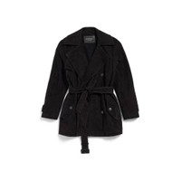 Cocoon Short Trench in black vintage looking suede for Women PRODUCT DETAILS • Vintage looking suede lambskin • Dry fleece lining • Trench lapel • 2 shoulder tabs • Raglan sleeves • Storm flap at front and back • 6 button double-breasted front • 2 buttoned flap side pockets • Buttoned tightening straps at cuffs • Tone-on-tone belt with leather buckle • Made in Turkey Main material: lambskin