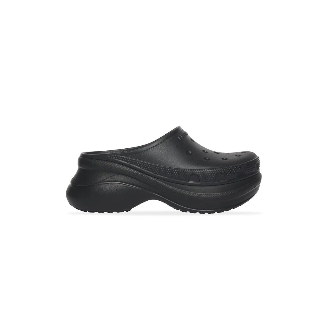 Crocs™ Mule in black rubber PRODUCT DETAILS • Rubber • Mule • Round toe • Open at back • 5mm arch • Balenciaga logo debossed on the upper • Embossed size at back • Tone-on-tone sole and insole • Made in China • Crocs™ collaboration • Wipe with a soft cloth Material: 100% EVA