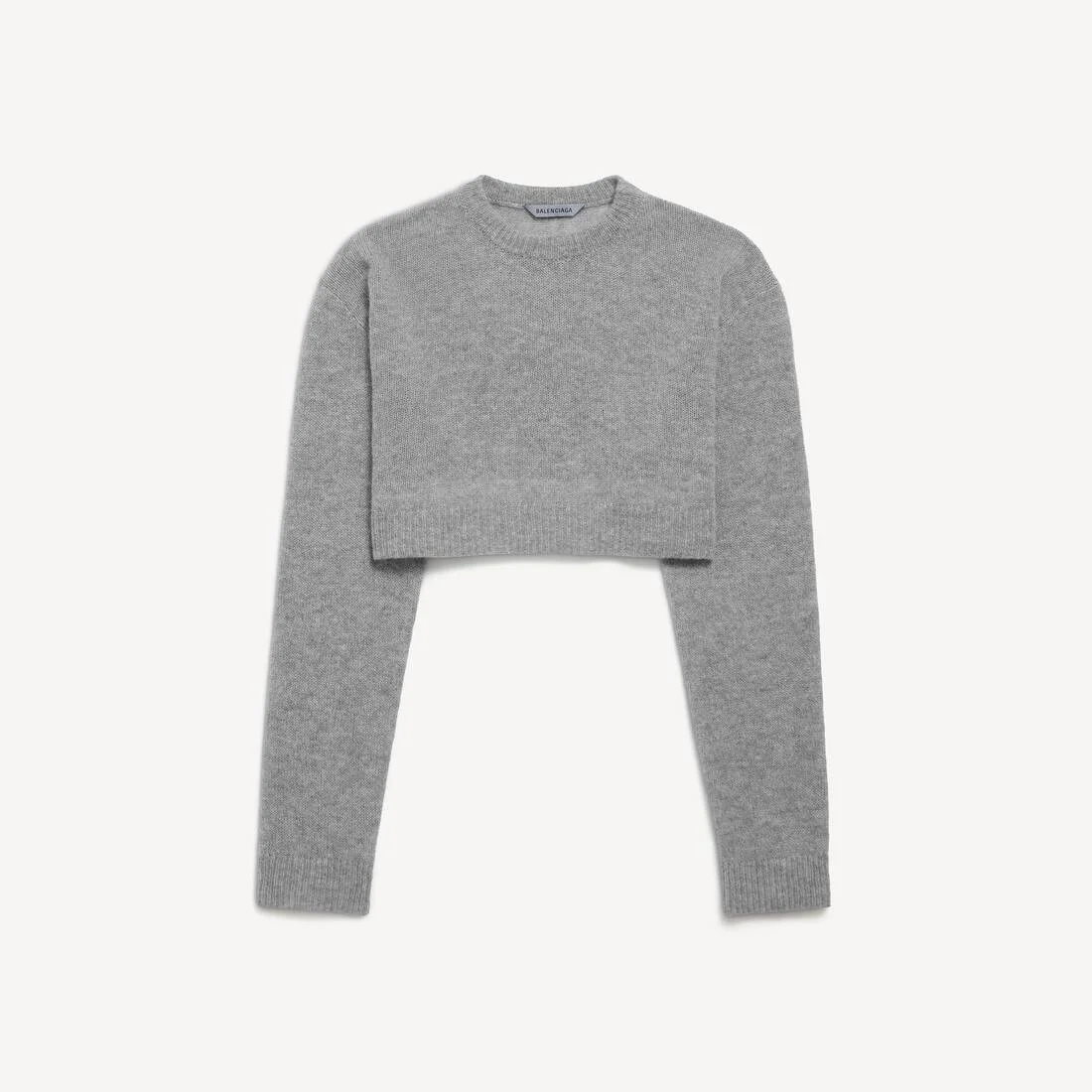Cropped Crewneck in heather grey open-knit cashmere PRODUCT DETAILS • Open-knit cashmere, breathable feel • Crewneck • Dropped shoulders • Long sleeves • Cropped length • Embroidered Balenciaga knit patch on the back • Ribbed trims • Made in Italy Main material: 100% cashmere